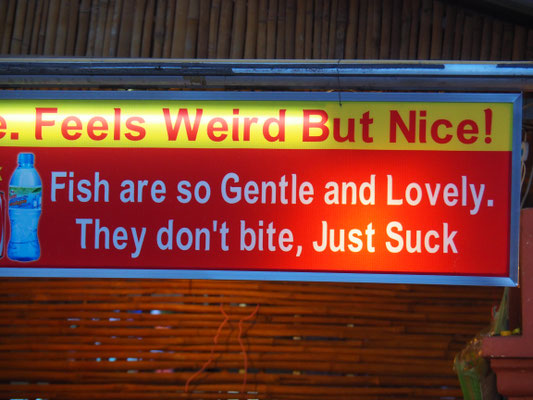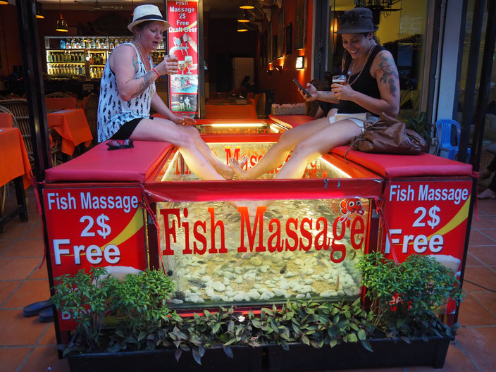 Und dann treffen wir den Modearzt von Siem Reap: Er logiert im Aquarium und seine Honorare können sich sogar Traveller leisten. Er beseitigt gründlich die Hornhaut und massiert. Und bei Dr. Fish gibt es sogar gratis Bier!!!